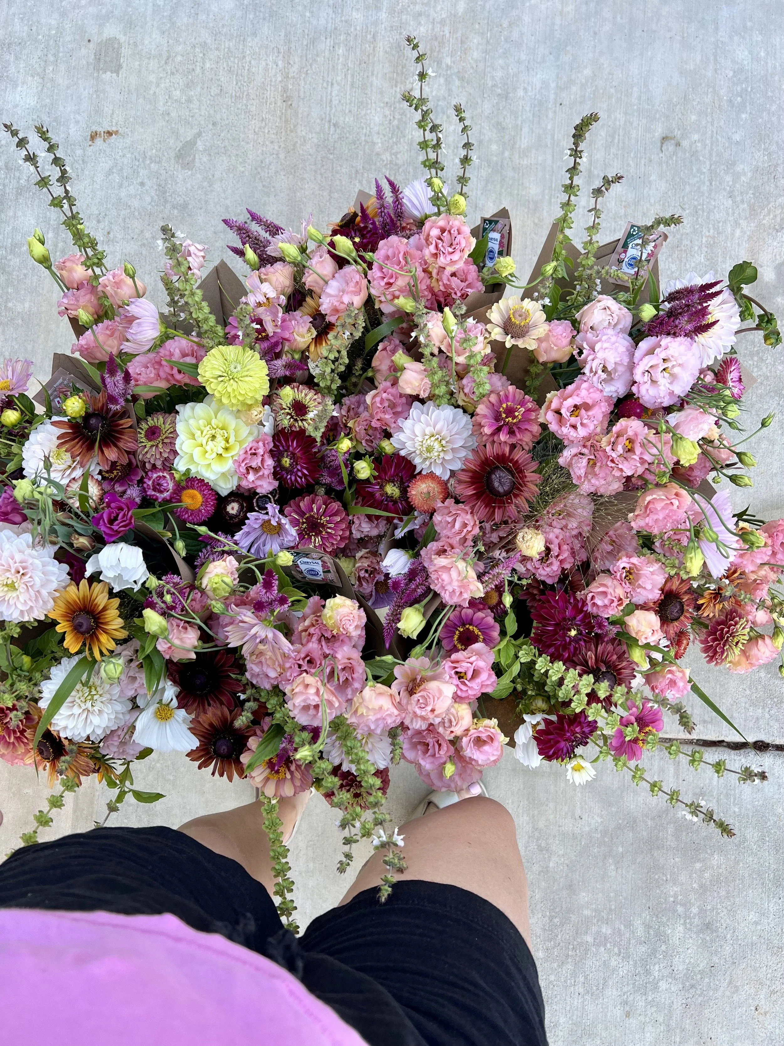 Fall bouquet subscriptions celebrate the transition of summer into autumn. You can expect your bouquets to be bursting with blooms like zinnias, sunflowers, cosmos, snapdragons, celosia, lisianthus, basil, and mums! The Fall 2025 Bouquet Subscription is on sale now. This fall—I’m offering pickup at the farm in Garden Valley, Cool Beerwerks, Terry’s Pizza, and in El Dorado Hills at the EDH Town Center Farmer’s Market.